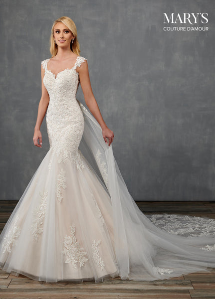 Captivating fit and flare wedding dress with a sweetheart neckline, embellished cap sleeves and a matching sheer cut away back neckline. The entire gown features beautiful floral embroidery, dazzling crystal beads and full flared tulle skirt.